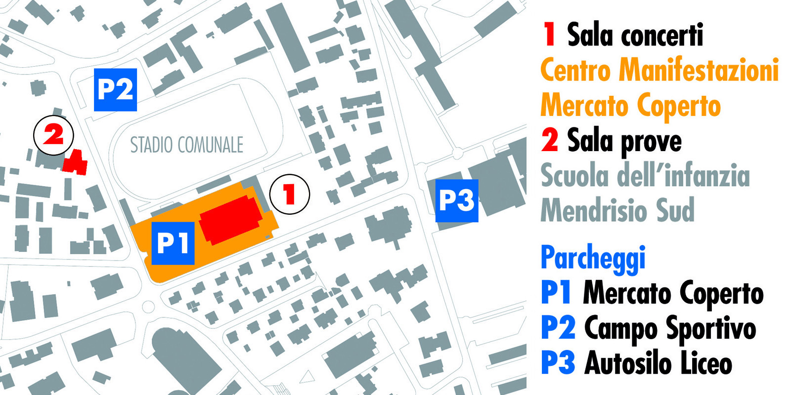 La sala prove è stata allestita nell’ex sala prove della Civica che si trova nel seminterrato della Scuola dell’infanzia Mendrisio Sud (vedi cartina in basso).
